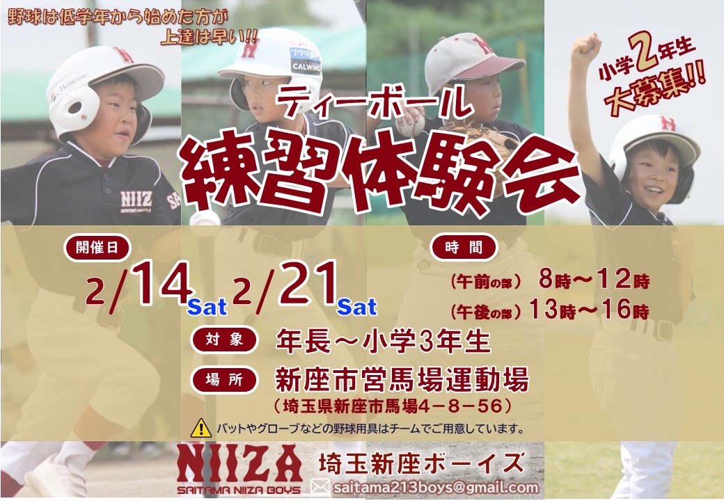 低学年選手対象のティーボール体験会、2/14(土)と2/21(土)開催いたします。